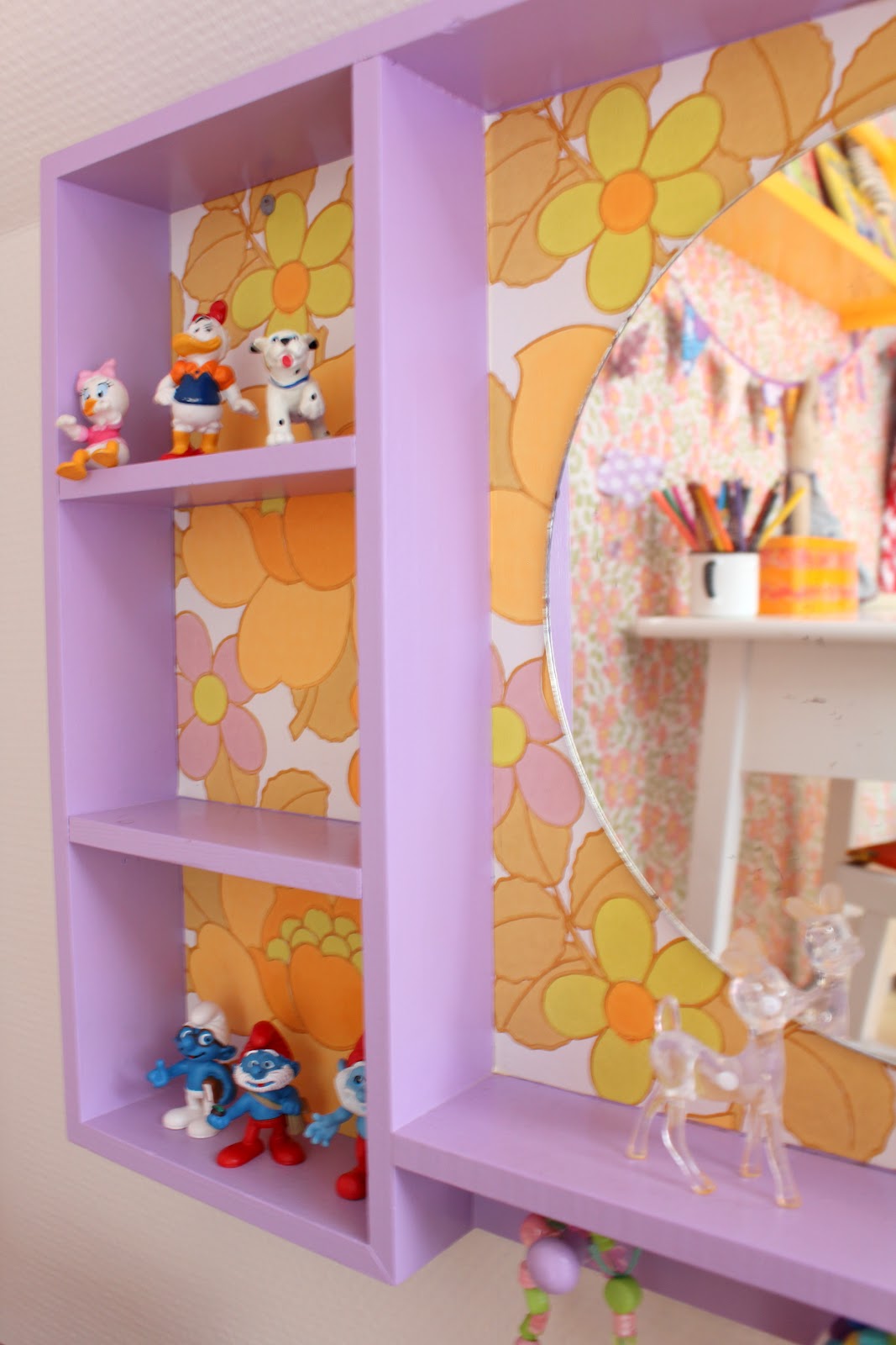 De forandringer der er sket her på værelset udover tapetet, er at æblepigen har fået nyt tøjskab og bord og stol til at side og tegne ved. Så er madressen flyttet over til en anden væg, og det lille skab til legesager er flyttet til under vinduet. På det lille skab har jeg sat nogle Pony ting jeg har købt brugt, lidt med den tanke at æblepigen jo ikke skulle lide under mors trang til retro, men jeg må sige at det er ikke så meget hun leger med det, så måske det ender med at jeg skifter det ud igen. jeg går og drømmer om at finde et rigtig fint gammel dukkehus, det vil være den perfekte plads til en dukkehus lige der under vinduet og i en perfekt højde til at lege men, nu får vi se om den dukker op en dag.